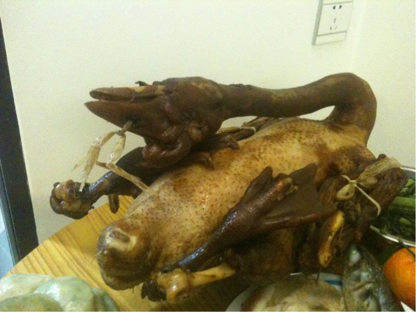 狮头鹅。ずしっと重いです。はかってませんけど4、5キロはありそうでした。これを正月から解体して延々食べる訳です。5日間くらい食べ続けました。
