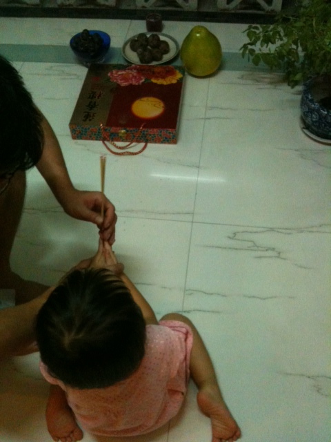 珍しく晩酌して、いい気分で眠くなった夫(下戸です)が「お参りしておいて」などと言うので、それは困るとお尻を叩いてお参りさせました。だいたい、夫のために中国風に中秋節を過ごしている部分が大きいのに。あの酒量で・・・仕方ないけど、しっかりしてください。