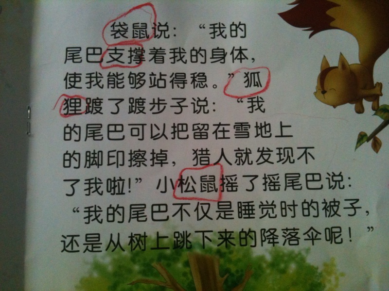 息子に読ませると、全然字を追わずに話を再現している感じで、その証拠に、意味が同じでも異なる表現で読み進めることがあります。分からない字も似たような意味の字をあてずっぽうで言ってみたり。それから、就、到、是、这などのよく出てくる字が単独だと読めなかったり。先ほどの字に至っては意味もよく分からず、覚えているみたいです。(どんな意味か聞いたら、お腹を出しながら歩くなどと適当なことを言っていました