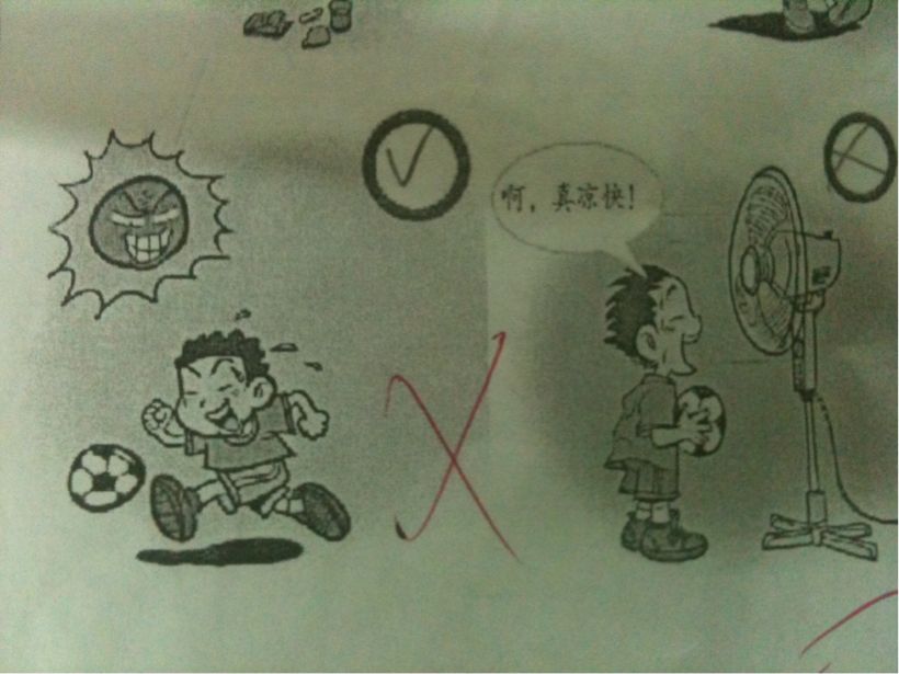 家でふざけすぎて汗をかいてしまって、扇風機の強風に当たっている息子を見たら、私も「そんなそばで風に当たっちゃダメ」と注意します。これは家でよく注意しているので、テストでも「間違っている」と判断したようです。