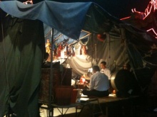 人形版潮劇のやぐらがあり、中でおじいちゃんたちが工夫茶を飲んで休んでいました。