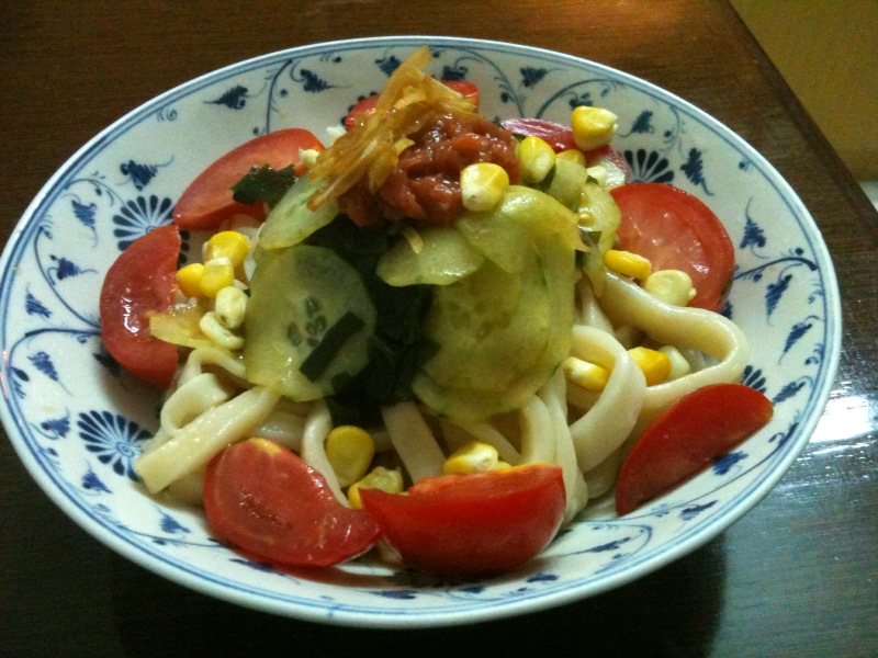 今日はサラダうどん。梅のたたきが乗ってるのがポイント。