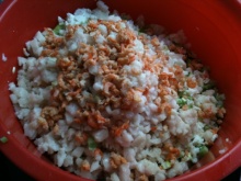 くわい、豚肉、豚脂身、葱、エビ(干したもの)、魚骨の干物に卵、炒って細かく砕いた山椒、小麦粉を混ぜ、塩、砂糖で味付けたものを