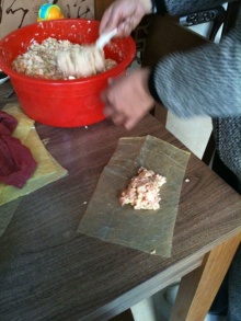 湯葉で出来た皮で棒状に巻きます。