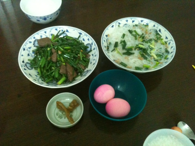 豚レバーをニラの花と一緒に炒めて、春雨は豚ミンチとネギと一緒に煮ました。