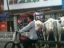 これは、ヤギを乗せて走るバイク。ヤギのミルクを売っています。呼び止めて、その場で絞ってもらうこともできます。その他、牛を引いて歩いて牛乳を売る人もいます。(補足;普段は橋や辻にいて、そこに買いに行くようです。で、市内を転々としている、その移動途中を写真に撮ったのだと思います。)